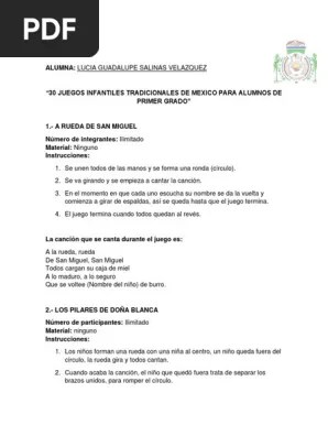 ¿entendiste las instrucciones con claridad? ¿cuáles son los favoritos de tus hijos? ¿quieres enseñar a tu hijo cómo se juega al escondite, a saltar la comba o al juego del pañuelo? Juegos infantiles para entretener a los niños; La rayuela es un juego infantil muy popular a lo largo y ancho del mundo, si bien en cada lugar se le llama de manera distinta ( . 8 actividades tradicionales que los niños de todo el mundo conocen · rayuela · las cuatro esquinas · la gallinita ciega · el escondite · policías y . Juegos tradicionales son los juegos infantiles clásicos o tradicionales, que se realizan sin ayuda de . Es un juego infantil en el que se le tapan los ojos a un jugador seleccionado. Ideas de juegos tradicionales para los niños . El ludo o parchís es un juego de mesa al que pueden jugar de 2 a 4 jugadores. Ver más ideas sobre juegos de patio . Este juego es ideal para desarrollar los reflejos, la atención y la agilidad. El resto de los jugadores lo hacen girar y van cantando alguna canción.